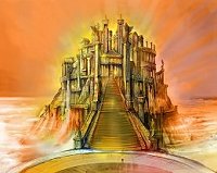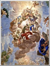 mysterious region far above the earth. It is written that Zeus talks to the gods from "the topmost peak of many-ridged Olympus," and only a little later he says that if he willed he could hang the earth and sea from a pinnacle of Olympus, clearly not a mountain. In either case, Olympus is not the equivalent of heaven. According to the writer Homer, Poseidon says that he rules the sea, Hades the dead, Zeus the heavens, but Olympus is common to all three. The entrance to Olympus was a great gate of clouds, kept by the Seasons. Within were the gods’ dwellings where they lived and slept and held court. In its great halls they feasted on ambrosia and nectar and were entertained by Apollo’s lyre, the Graces and the Muses. Nectar was a sweet drink made from fermented honey, and ambrosia was said to be an uncooked mixture of honey, water, fruit, olive oil, cheese and barley, disgusting as that sounds... Others claim that a specie of speckled mushrooms were the true food of the Olympians, created whenever Zeus' thunderbolts struck the earth, and that this was what kept them immortal. The Olympians were fond of the smell of roast beef and mutton, but didn't like the taste, so mortals would sacrifice sheep and cattle to them, but afterwards would eat the meat themselves. The deities who did not live on Olympus, such as the gods of the Underworld, the earth or the sea, would arrive when summoned by Zeus. The builders of the palace at Olympus were the Cyclopes, gigantic one-eyed Titans who were freed by Zeus from Tartarus and in thanks gave him his famous thunderbolts. Hephaestus, the talented god of the smiths and the forge created all the furnishings and artwork on Olympus, even making some of the chairs and tables able to move themselves in and out of the celestial hall. The private quarters of King Zeus and his wife Hera were located at the southern end of Olympus and overlooked the famous Greek cities of Athens, Thebes, Sparta, Corinth, Argos and Mycanae. At the northern end of the palace, facing the wild hills of Macedonia, were found the kitchen, banquet hall, armory, workshops and the servants' quarters. In between was a square court, open to the sky, with private rooms on either side belonging to the other five Olympian gods and five Olympian goddesses. Past the kitchen and servants' quarters were situated cottages for lesser gods, as well as the stables, chariot sheds, dog kennels and the Olympians' private zoo, where the deities kept their sacred animals. Zeus held court at Olympus seated on an enormous throne of polished black Egyptian marble, adorned with gold. Each of the seven steps leading up to it were enameled with one of the colors of the rainbow. A bright blue covering above symbolized that the whole sky belonged to Zeus alone. A ruby-eyed golden eagle perched on the right arm of his throne and a purple ram's fleece covered the cold seat. Zeus used this fleece for magical rainmaking in times of drought. Queen Hera's throne was made of ivory, with three crystal steps leading up to it. Willow leaves and golden cuckoos decorated the back, and a full moon hung above it. Hera's seat cushion was a white cow skin, which she used to make rain when Zeus was too busy or couldn't be bothered to end droughts. Zeus and Hera's thrones faced down the Council Hall towards the door leading into the open courtyard. Along the sides of the hall stood ten other thrones, five on each side, each one belonging to the other ten main Olympians. Homer says that no wind ever shakes the untroubled peace of Olympus; no rain ever falls there or snow; but the cloudless firmament stretches around it on all sides and the white glory of sunshine is diffused upon its walls.